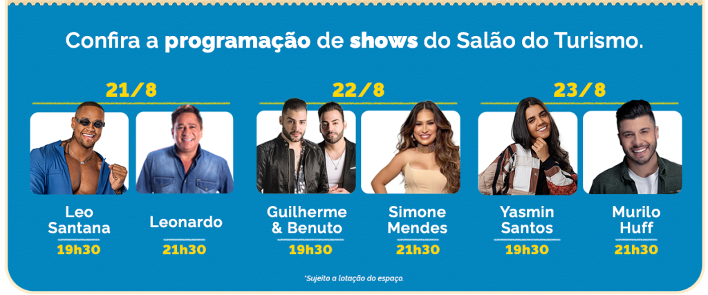 O Salão do Turismo do Brasil, promovido pelo Ministério do Turismo, será realizado de 21 a 23 de agosto, no Distrito Anhembi, em São Paulo, com entrada gratuita. Para este ano, além da programação habitual, com gastronomia e destinos turísticos, o evento promete atrações musicais. Na quinta-feira (21), o público vai curtir a energia contagiante de Léo Santana e do sertanejo clássico de Leonardo. Na sexta-feira (22), Guilherme & Benuto e Simone Mendes entram à grade da noite com um verdadeiro espetáculo com seus maiores hits. No sábado (23), para encerrar o evento com chave de ouro, o palco ficará por conta da voz marcante de Yasmin Santos e do romantismo de Murilo Huff.